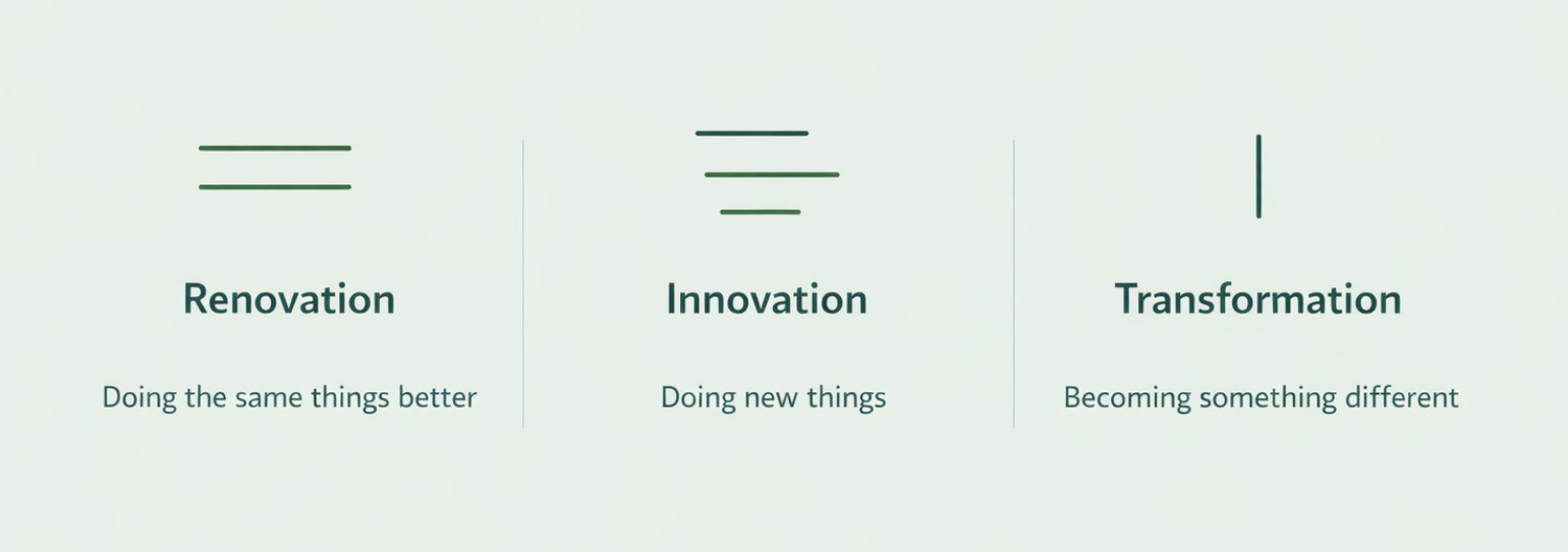 In practice, many of these efforts are renovations. They streamline processes, reduce delays, or upgrade systems. This work is valuable and often essential. But it is not the same as creating something genuinely new, and it is certainly not transformation.