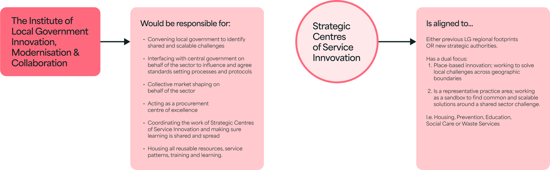 | Set-up and test eight regional Centres of Strategic Innovation, geographically spread across England. Set-up to focus on both place-based innovation & data exchange and sector wide sandboxing across common local government challenges. | Offer secondments into Centres of Strategic Innovation for those in digital, service delivery and finance roles to drive development and spread of sector wide solutions. |