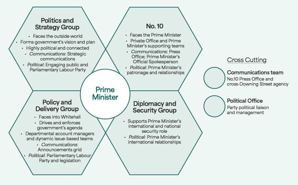 No.10 Private Office: A tightly refocused Prime Minister’s Office at the centre of the Downing Street operation, led by the Private Office. All the staff in this group directly support the Prime Minister and run the functions he needs closest to him.